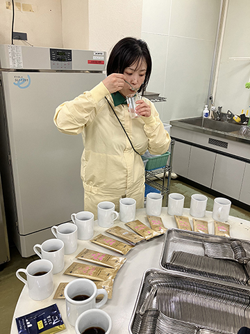 現在、管理部で品質管理グループの係長職を担う谷口愛美さんは、「この工場で使っているコーヒー豆の調達の段階から品質管理の仕事がはじまります。商品化に適したコーヒー豆かどうか、つまり調達するか否かの検査もここで行っています」と、品質管理の役割について語ってくれました。
