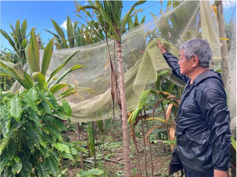 花の開花が、徳之島でのコーヒー栽培が順調であることを示している一方で、その背景にはいくつもの難題があったようです。例えば、コーヒーノキに陽が当たりすぎないよう、日陰をつくる役割として寄り添うように植えられているセンネンボク。2021年はまだセンネンボクが十分に成長せず、コーヒーノキに陽があたり過ぎて弱っている状態でした。その対策としてネットを張りましたが、翌22年はセンネンボクが高く育ってくれたので、ネットの取り外しを実施。