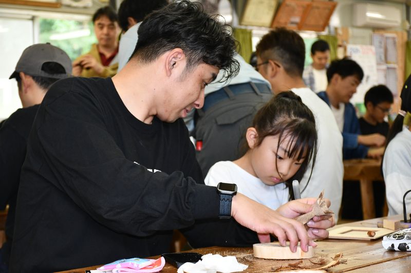 参加者は、選手と一緒に丸太切りやコースターづくり、どんぐりなどをボンドでつけて飾るフォトフレームづくりなどに挑戦し、親子で世界にひとつだけのクラフト作品を完成させました。子どもたちが自分の作品を発表する姿を、目を細めて見守るお父さんたち。父の日を彩る心温まるひとときとなりました。