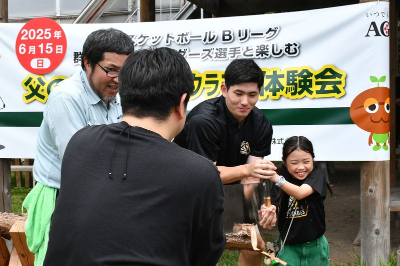そんな想いを胸に、群馬クレインサンダーズと味の素AGF(株)は一般公募で集まった14組28名の親子を招き、「父の日 親子木工クラフト体験会」を群馬県前橋市にあるサンデンフォレストで開催。当日は群馬クレインサンダーズの細川一輝選手、池田親平アシスタントコーチが参加し、前橋市の阿久澤萌市議も駆けつけてくれました。