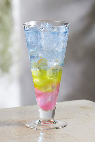 そんなカラフルなオリジナルメニュー開発に活用していただきたい「AGF®プロフェッショナル」商品が「自由自彩」。この商品は溶かす水の量で濃度を調節することで、比重の差を利用したカラフルな色の組み合わせを楽しめます。カラーは赤(いちご味)、黄(レモン味)、青(グレープフルーツ味)の3種で、単色だけでなくグラス中で2~3色を層で組み合わせたり、各色をミックスさせることによる多彩なカラーバリエーションも自由自在。炭酸水、ソフトドリンクでノンアルコールカクテル、ジン、ホワイトラム、ウイスキー、焼酎などでアレンジすることで、バーカクテルのような映えるドリンクも手軽にお作りいただけます。