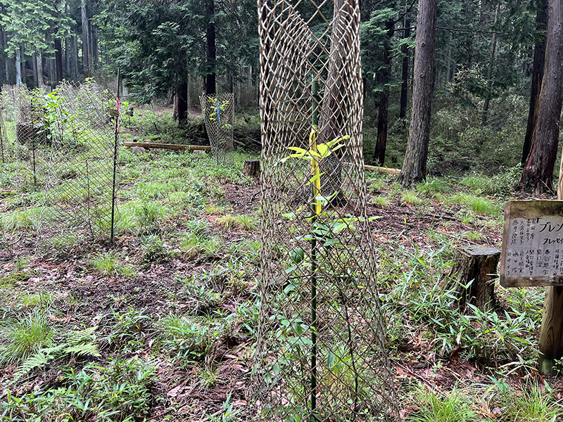 「AGF®ブレンディ®の森」群馬には新たな森づくりのための植樹エリアがあります。そこには花粉症の原因となる花粉飛散の少ない品種のスギの幼木を植えて、イノシシやシカなどによる獣害対策としてネットを張り、継続的に笹や雑草などの下草刈りを行ってきました。最初に植えた数十センチだったスギの木は、今や10メートル近くまで育っています。