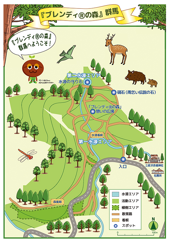 群馬県太田市にあるAGF関東株式会社は、その利根川水系の水を利用して生産活動を行ってきました。その水源となるのは利根川水系荒砥(あらと)川です。「AGF®ブレンディ®の森」群馬は、その荒砥川源流域である前橋市北部、赤城山南麓の一角に位置しています。