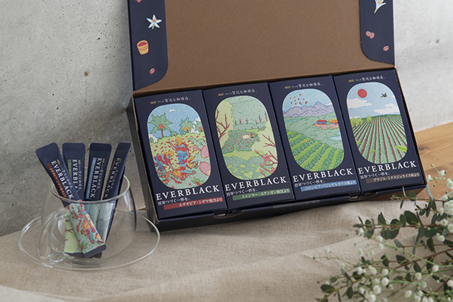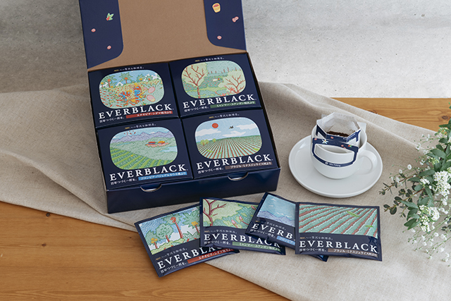 さまざまな生産地で栽培されたコーヒー豆が、地球を巡って香り高い一杯のコーヒーになるまで……普段私たちはそうしたプロセスについてあまり意識せずにコーヒーを味わっています。しかし「産地共創」を進める中で、さまざまな困難に立ち向かって品質の高いコーヒー豆を生産する人々に出会い、そのストーリーを多くの方に知っていただきたいと考えるようになりました。「ちょっと贅沢な珈琲店R」ブランドで発売した「ちょっと贅沢な珈琲店REVER BLACKR」はそうした私たちの思いをカタチにした特別な商品シリーズです。先ほどお話ししたFNCとの産地共創を図っているコロンビア・バジェデルカウカ県のほか、日系ブラジル人農園主が運営するブラジル・ミナスジェライス州、さらにエチオピア・シダマ地方、ミャンマー・ユアンガン地区のそれぞれ個性豊かなアラビカ種生豆を原料としたシングルオリジンコーヒー4種をラインナップしました。各産地の情景をイラストにしたパッケージとともに、コーヒーがお手元に届くまでの物語を味わっていただければと思います。