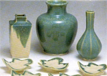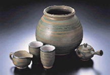 八戸焼は、江戸時代末期まで八戸市内の蟹沢山中で焼かれていた焼物。現在の八戸焼は昭和50年に窯元初代渡辺昭山の手によって再興されたものです。蟹沢山中にて奇跡的に窯跡が発見され、出土した陶片を参考に試行錯誤の後、独自の八戸焼が作り出されました。青森の大自然に育まれたブナの色、または、三陸の荒波に揉まれた海藻の色とされる独自の緑釉が施されています。震災により、使用していた新窯と作品が破損してしまい、代用の窯で制作を行っている状況です。