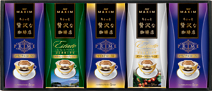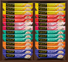 G(5品) | 深いコクと芳醇な香り、澄んだ後味が特長の〈マキシム〉ちょっと贅沢な珈琲店インスタントコーヒーに加え、人気の〈マキシム〉、〈ブレンディ〉〈マリーム〉などが入った、色々な味わいが楽しめるコーヒーギフトです。 |