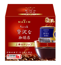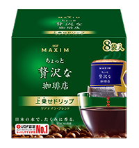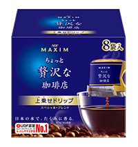 「〈マキシム〉〈ちょっと贅沢な珈琲店〉レギュラー・コーヒー 上乗せドリップ」は、上質なアラビカ豆をブレンドし、いつもよりちょっと贅沢に10g使用。独自の新技術「T2ACMI(たくみ)焙煎®」※技術で絶妙なバランスに仕上げた上乗せタイプの1杯用レギュラー・コーヒーです。ユニバーサルデザインフォーラムに認定されたセットしやすさ評価NO.1のドリッパーを使用。お湯に浸からないため、珈琲店のマスターが淹れたような上質な香り立ちと澄んだ後味が楽しめます。