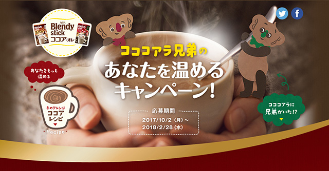 | キャンペーンタイトル | 「ブレンディ®」スティック ココア・オレ コココアラ兄弟のあなたを温めるキャンペーン |