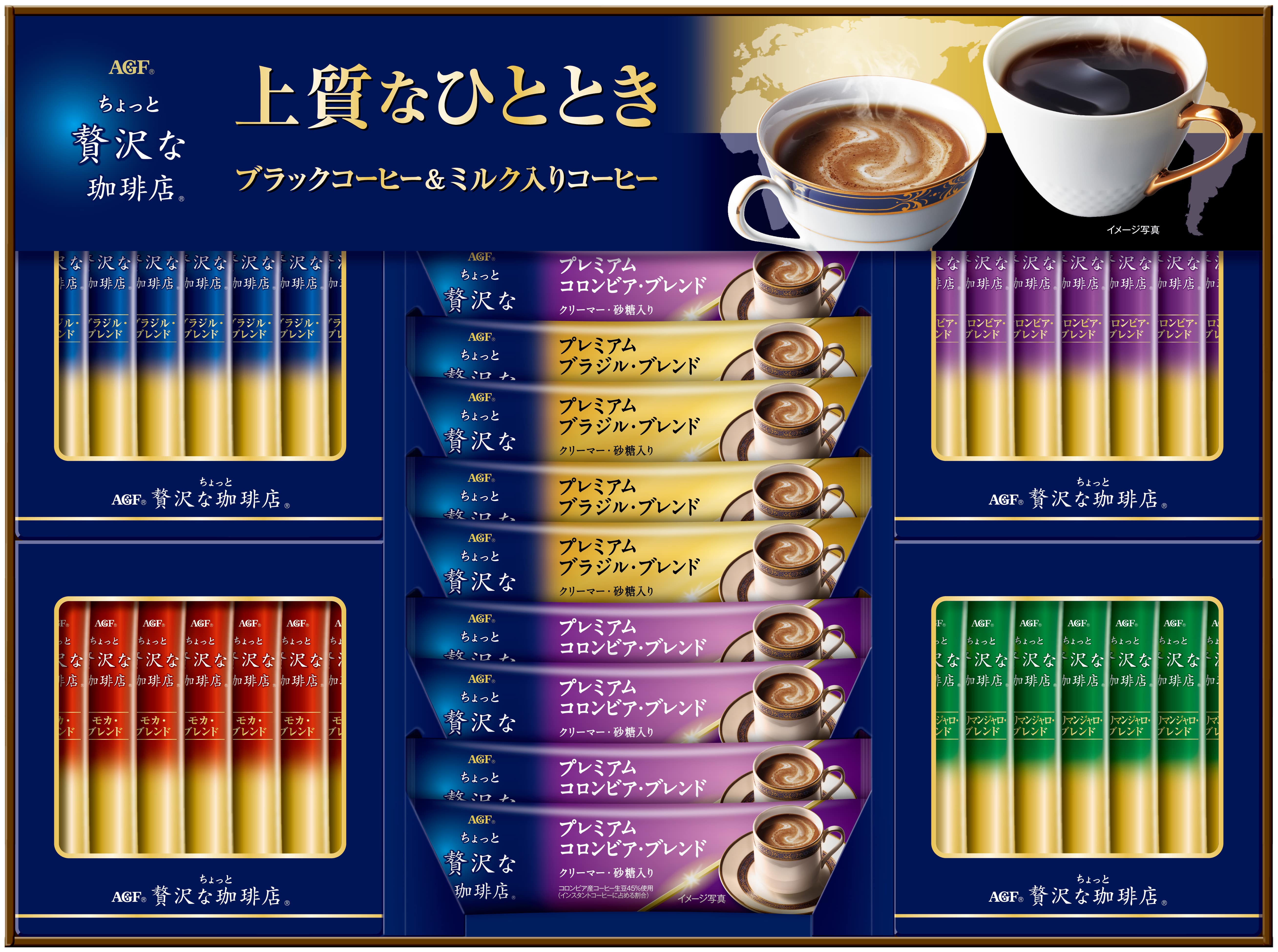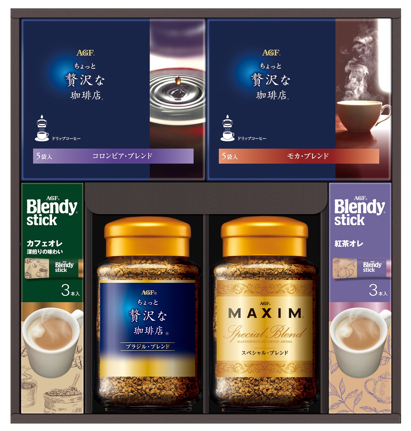 香りを楽しむ「ちょっと贅沢な珈琲店®」ドリップコーヒーや、クリーミーなカフェオレが楽しめる「ブレンディ®」スティックなど、AGF®おすすめを揃えたギフトセットです。
