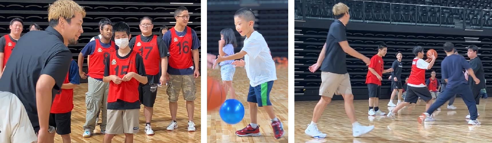 群馬県立高等特別支援学校高校生26名と太田特別支援学校小中学生13名が4つのチームに分かれてミニゲームを実施。プロバスケットボール選手と一緒に同じコートでボールを追いかけた後、谷口選手による3ポイントシュート企画をコートサイドから全員で応援。ゲームに参加して汗をかき、そして応援して楽しむ「バスケットボール体験型イベント」を実施。