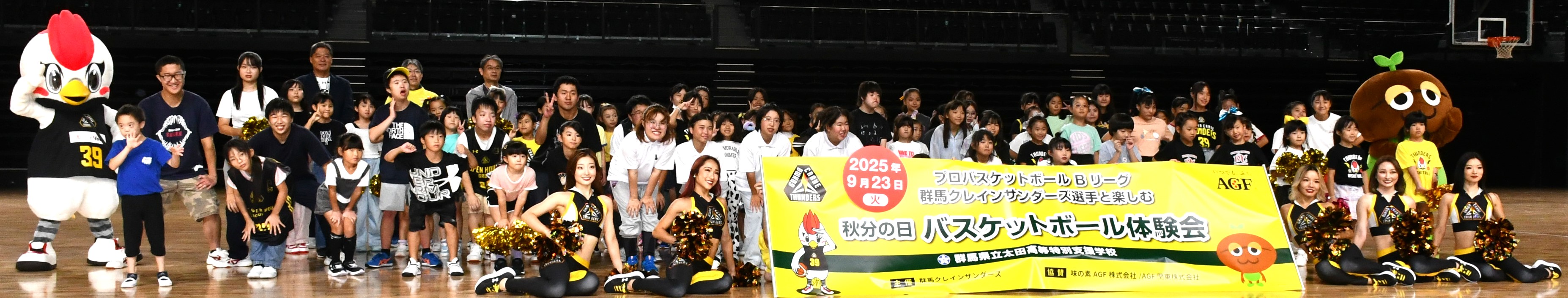「ココロとカラダの健康」への貢献を目指す味の素AGF株式会社(代表取締役社長:島本 憲仁 以下、味の素AGF)は、株式会社群馬クレインサンダーズ(代表取締役社長:阿久澤 毅、所在地:群馬県太田市)と、地域社会貢献活動第三弾として、群馬県立高等特別支援学校5校(太田市・前橋市・高崎市・伊勢崎市・館林市)高校生26名と太田特別支援学校小中学生13名を招いた「バスケットボール体験会」、および一般公募参加者78名を招いた「チアダンス体験会」を2025年9月23日(火)、オープンハウスアリーナ太田(太田市総合体育館)(太田市飯塚町)にて開催しました。