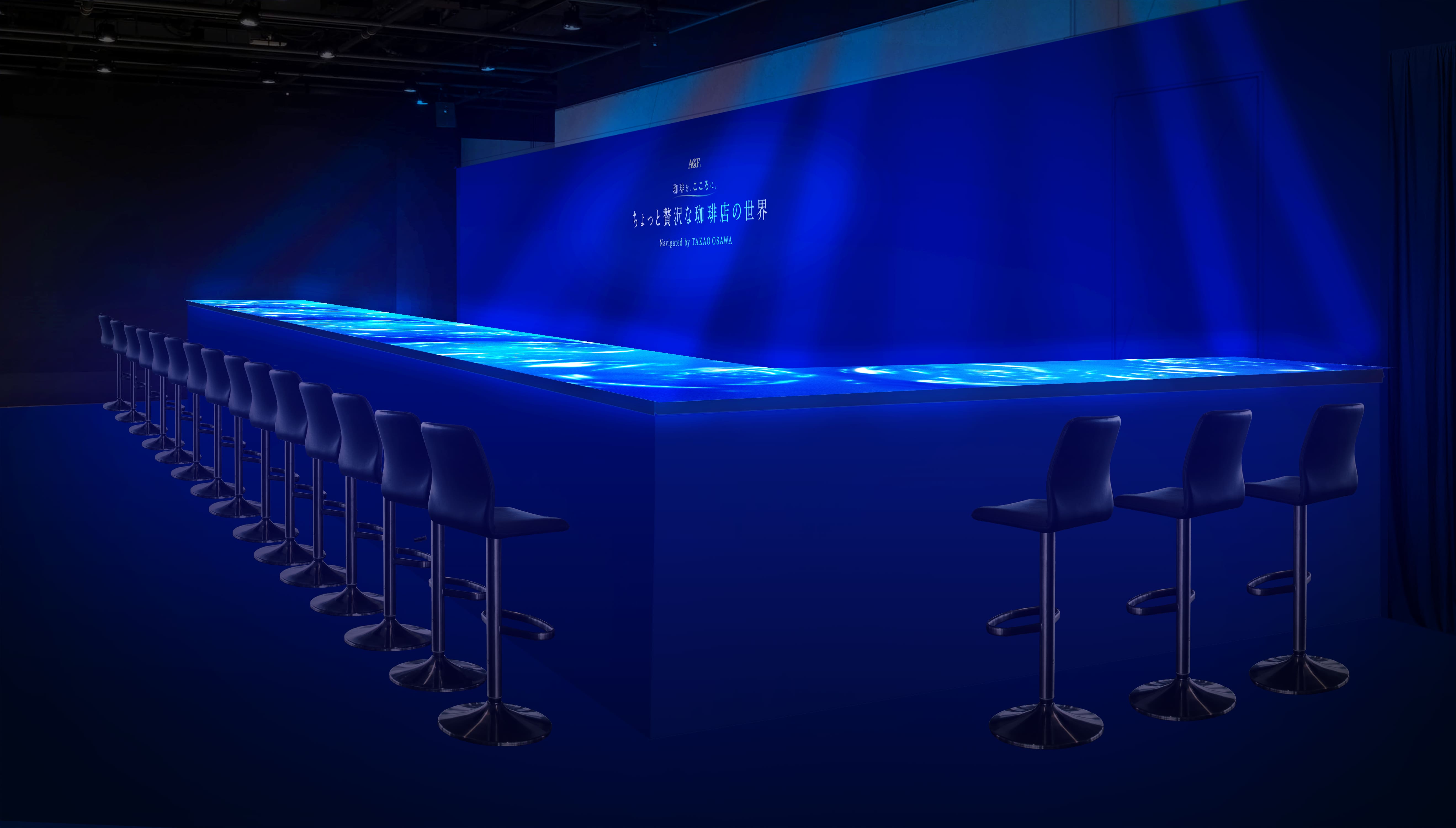会場に足を踏み入れると、日常の喧騒から切り離された深い青の空間が広がり、同ブランドの新TVCMに出演中の大沢たかおさんによる、本イベント限定の録り下ろしナレーションが来場者を優しくナビゲート。バリスタが珈琲を淹れる所作と、会場を包み込む映像、音楽、ナレーションが連動し合い、珈琲の香りが満たす落ち着いた空間で、五感を通して感情がゆるやかに解きほぐされていくような没入感を味わいながら珈琲1杯をお愉しみいただけます。