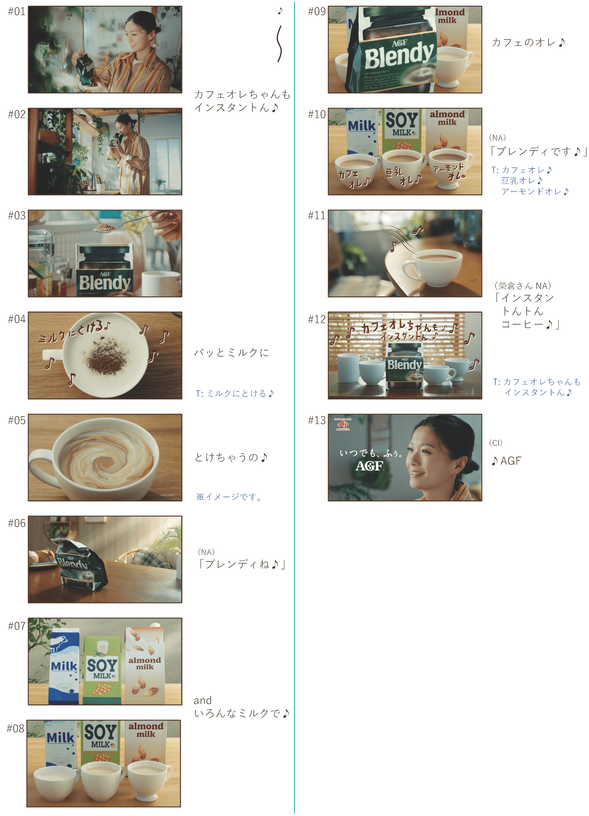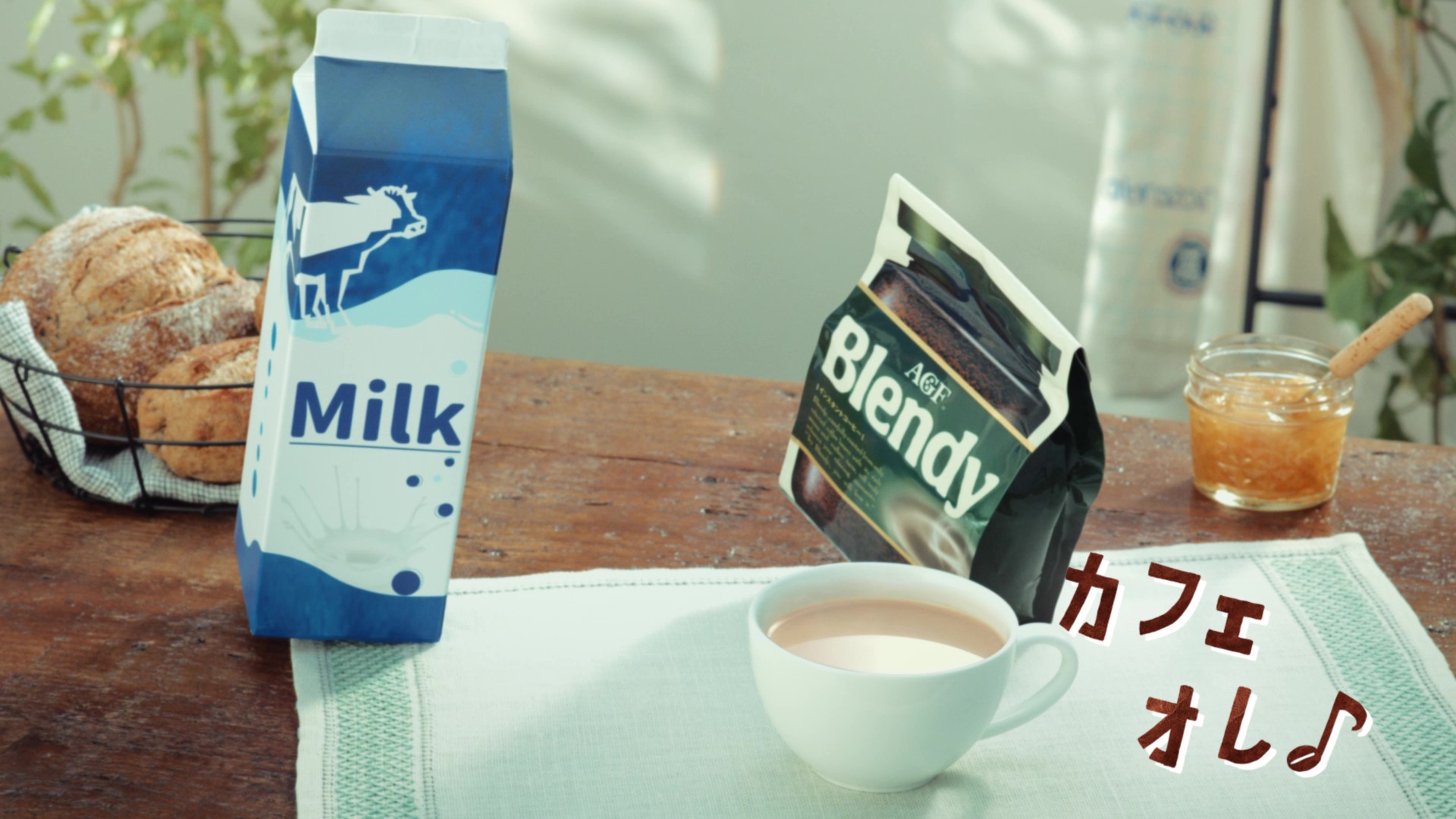豊かなコクと香りが特長で、牛乳はもちろん、豆乳やオーツミルク、アーモンドミルクなどの植物性ミルクとも相性が良く、カフェで飲むようなオレが手軽に楽しめる「ブレンディ®」インスタントコーヒーより、新TVCMを公開します。本TVCMでは“カフェオレちゃんも、インスタントん”という新たなキーコピーを中心に、様々なミルクに「ブレンディ®」インスタントコーヒーを加えるだけでカフェで飲むようなオレが手軽にご自宅に楽しめる点を伝達しています。
