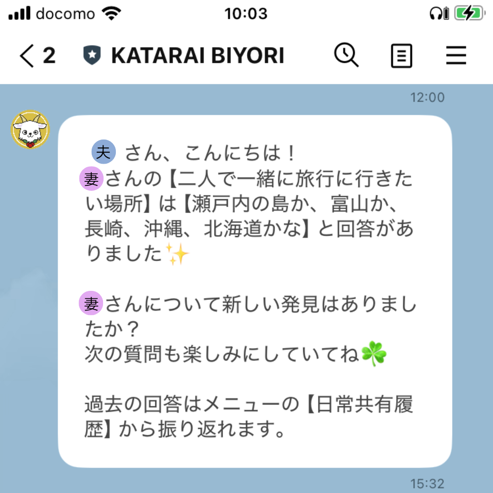 サービスLINEを通して執事のメェープルくんが約1週間に1度のペースで、お二人に関する様々な質問を投げかけます。お二人とも回答いただくことで、回答結果が共有され、お互いに関して新しい気づきや会話のきっかけとなります。