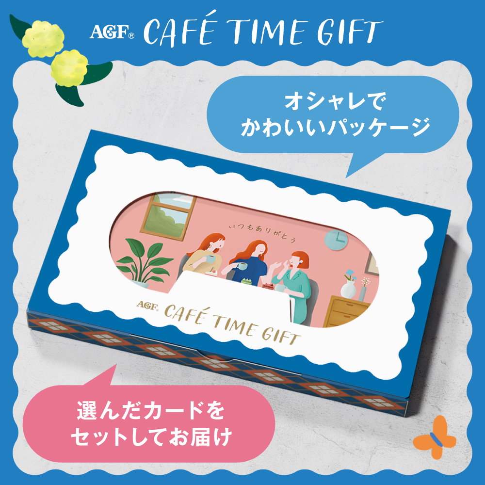 《AGF® カフェタイムギフト(スティックアソート/ドリップアソート)》は、贈る相手や、一緒に過ごしたいシーン、気持ちをデザインした様々なメッセージカードから1つを選ぶことができ、渡したその時も、会っていないその後も心のつながりを感じられるギフトです。