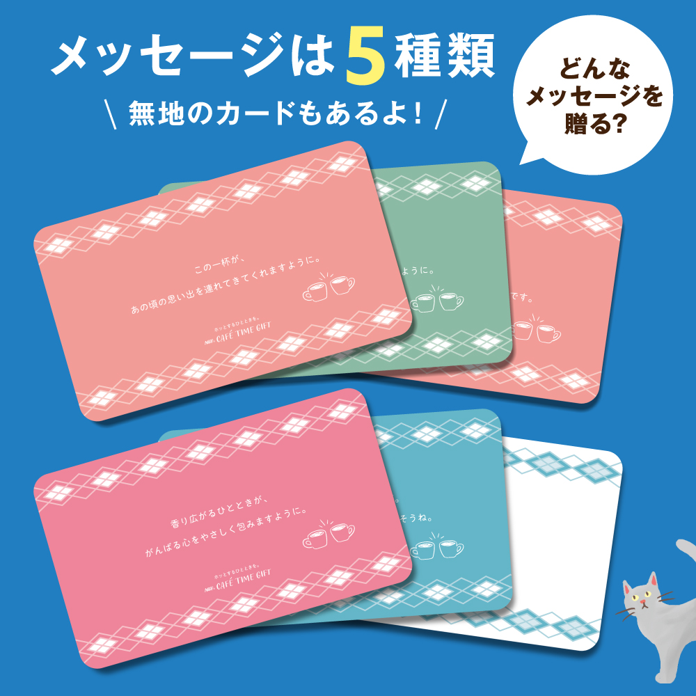 贈り手と貰い手の大切な関係をつなぎ、一緒にコーヒーを飲むひとときや、会話のきっかけを提供してくれるアソートギフトです。スティックアソートタイプとドリップアソートタイプの2種からお選びいただけます。贈る相手や、一緒に過ごしたいシーン、気持ちをデザインした様々なメッセージカードから1つを選ぶことができ、裏面には未来の”一緒に過ごすひととき”のきっかけとなる メッセージを複数用意しています。