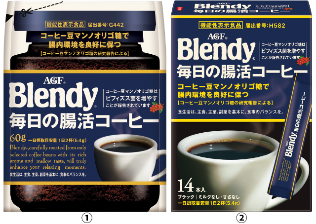 これまで、コーヒーで腸活が実践できるという日常生活への取り入れやすさとそのおいしさが高く評価され、“カラダを内側から整えたい”という生活者ニーズにお応えすることで販売も好調に推移しています※。一方で“まずは少量で自分に合っているか試したい”“外出先でも飲用したい”と感じている方も多くいらっしゃることがわかりました。腸活に興味がある方にとって生活に気軽に取り入れやすい容量の《「ブレンディ®」 毎日の腸活コーヒー袋60g》を新発売します。また1杯分の計量が不要でサッと作ることができ、持ち運びにも便利な個包装タイプ〈スティックブラック14本〉は機能訴求を強化したパッケージにリニューアルし発売します。