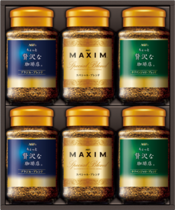 まずはストレートで楽しみたい「マキシムⓇ」や、産地によって特徴の違う深い香りとコクが愉しめる「ちょっと贅沢な珈琲店Ⓡ」をセットにした、インスタントコーヒーギフトです。